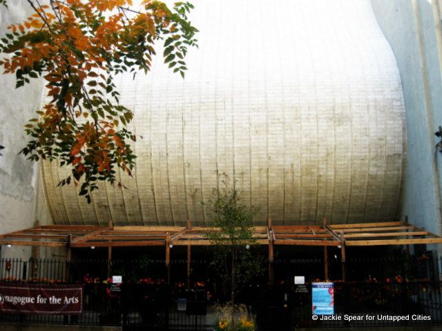 Continuing a few blocks East of 6th avenue, we stopped in front of the Synagogue for the Arts on White Street. Ironically for being a part of the historic Landmarks District, this building is not what the Tribeca Historic district is about. The Landmarks Commission was founded after this building was constructed around 1965. William Berger was the architect of this tear shaped building, which is made of reinforced concrete and covered by a veneer of thin white marble. It is wedged between two very traditional masonry buildings, which serve as a perfect contrast for this structure. There are gaps in the concrete to allow light within the sanctuary.