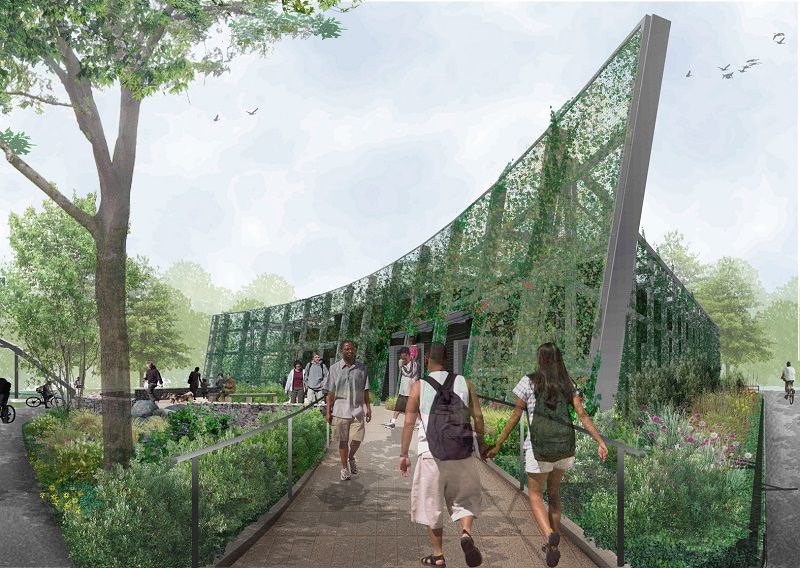 Birds-eye view showing Bronx River House and future bridge. Rendering by Kiss + Cathcart Architects.