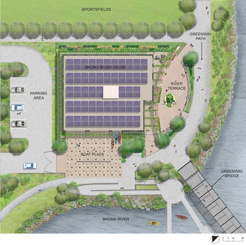 Note the Bronx River House’s solar panel roof in background