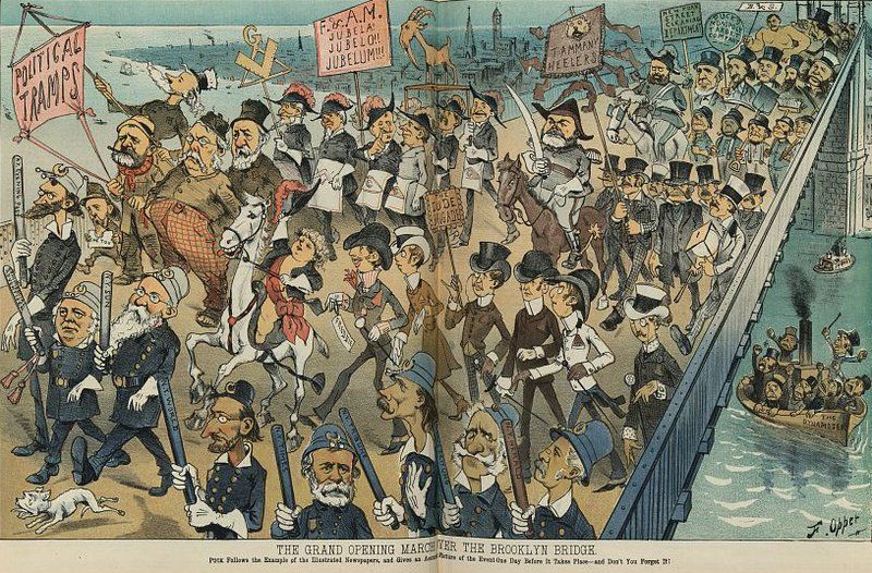 Grand Opening March over the Brooklyn Bridge. Frederick Burr Opper, artist, from the Illustrations from Puck. Image from Library of Congress.