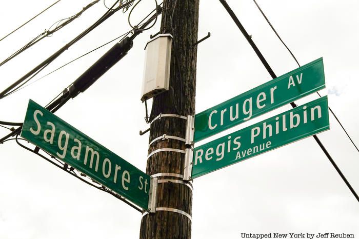 In the Bronx area of Morris Park, a street sign on Cruger Avenue between Sagamore Street and Bronxdale Avenue honors the legacy of Regis Philbin, the legendary broadcaster who passed away last Friday. Often considered the hardest working man in show business, Philbin grew up near the intersection of Cruger and Bronxdale Avenues and the street that bears his name, Regis Philbin Avenue.