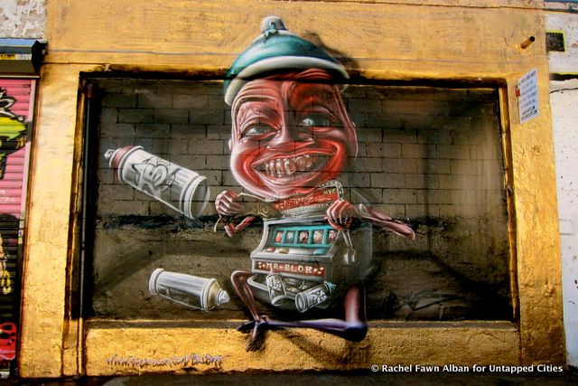 In Meres’ favorite mural, James Cochran used a spray paint pointillism technique to finish this portrait. Other recent works by the Australian artist include a famous mural of Usain Bolt to celebrate London’s 2012 Olympic Games. Look closely to see the hearts in the eyes, a signature feature of this artist.