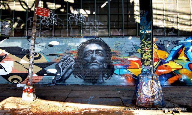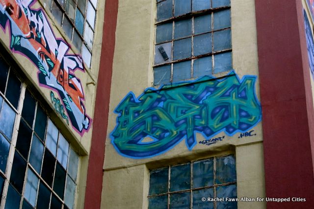 On a nearby wall is a newer, blue and green piece with a very moving history. Sey One, an artist who became wheelchair-bound due to an illness was hoisted up 2 stories by a team of other artists to do his highest piece ever. This may actually be the final piece of his lifetime, as he passed away in 2011. His work remains as a beautiful example of community support and teamwork through art-making.