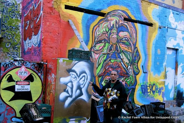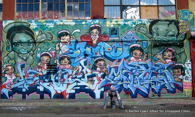 As we moved away from the loading dock area, Meres explained how working with graffiti artists in an increasingly popular venue has unique challenges. For example, some artists choose not to come because they do not want to be photographed by the influx of tourists coming to take pictures. Ironically, there has also been a problem with vandalism. Inexperienced, unknown writers have vandalized several buildings across the street, making it harder for Meres and 5pointz to maintain critical positive relationships in the neighborhood with property owners and the authorities. Unauthorized graffiti also appears on designated mural walls.