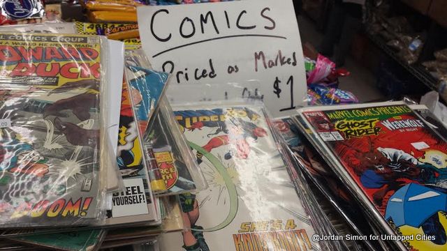 Besides candy and chocolate, the store has a display of comic books for only $1 dollar.