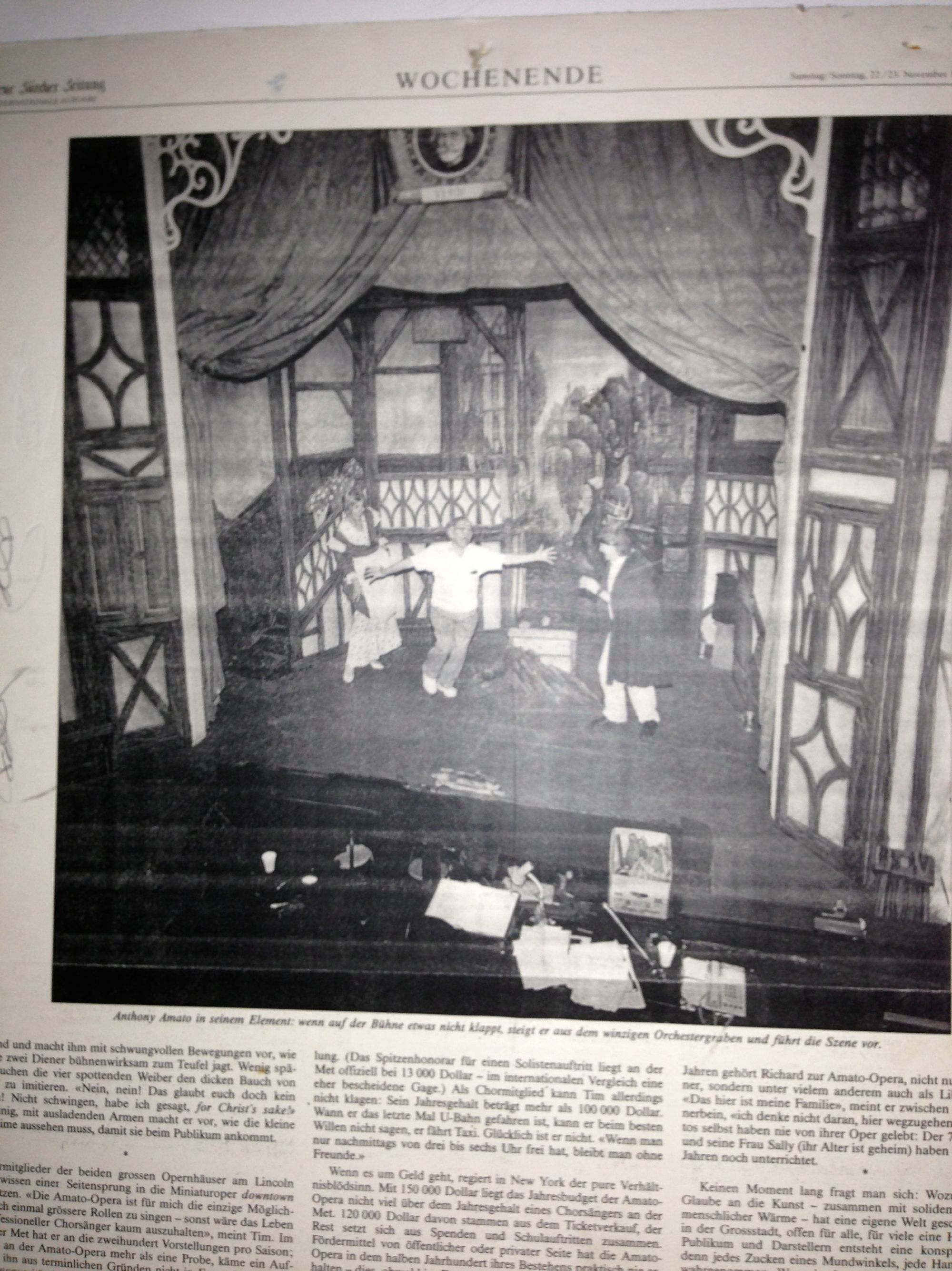 Antinio “Tony” Amato was the founder of the Amato Opera Theatre which opened on September. 12, 1948, in the basement of Our Lady of Pompeii Church in Greenwich Village. It later moved to the Bowery location in 1964. Originally a butcher, Amato left his job to pursue his passion in opera, and after stints at regional and summer opera companies, he founded the Amato Opera Theatre to give returning servicemen, many who were his students, a place to perform. A live performance can be seen on YouTube here and an image of the stage here.