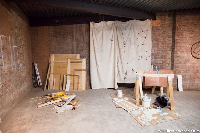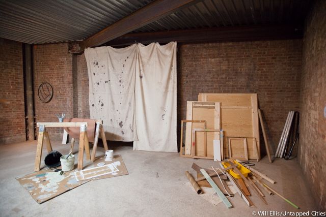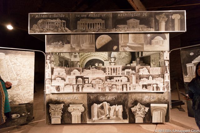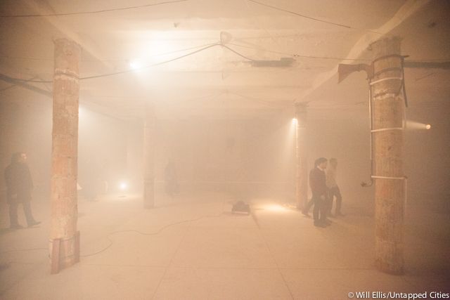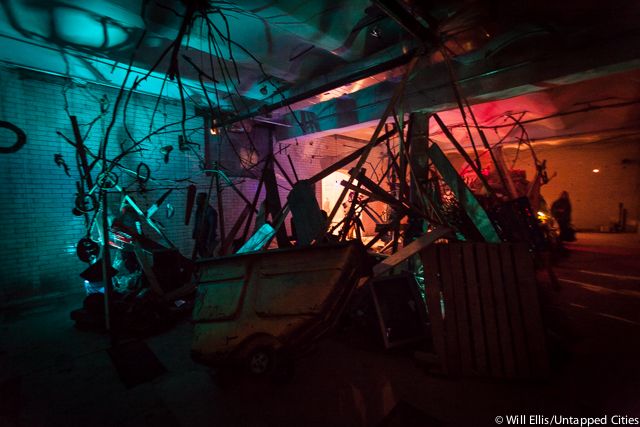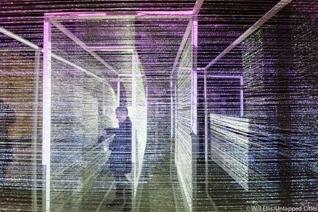 A basement stuffed with found objects and strobe lights was fittingly horrific. A neighboring chamber made use of a fog machine to dramatic effect. On the second floor, a fun interactive installation invited visitors to walk through a maze under the glow of projections and an oppressive strumming sound. The most disorienting work was an unassuming pair of rooms set up as artist studios, each dressed identically as a mirror image of the other, playing off the building’s symmetry.