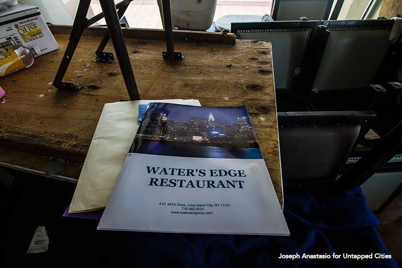 Water’s Edge opened in 1983, and for the next thirty-two years played host to an uncounted number of weddings, parties and power dinners. At the time of its opening, Long Island City was still primarily a warehousing and manufacturing district. The venue offered private access to stunning views of the Manhattan skyline that were hard to find anywhere else along this shoreline at the time. The restaurant reportedly cost three million dollars to construct. It was built on top of two permanently moored barges just off the rocky shoreline. Specializing in seafood, Water’s Edge offered entrees for $20 dollars, which is nearly $50 in 2018 dollars.