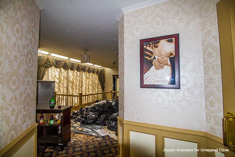 The summer after Water’s Edge closed I ventured over to see if it was accessible. While the front doors were padlocked, the perimeter around the building was wide open and un-fenced. At the rear of the building, I found several windows were smashed open. Once inside, it was readily apparent that “scrappers” (those who target disused buildings to steal copper wiring from them) had pilfered the place. Ceiling tiles were ripped out of place and lights dangled at crazy angles. Despite this destruction, much of the restaurant was surprisingly intact. The bar was even stocked with some leftover alcohol.