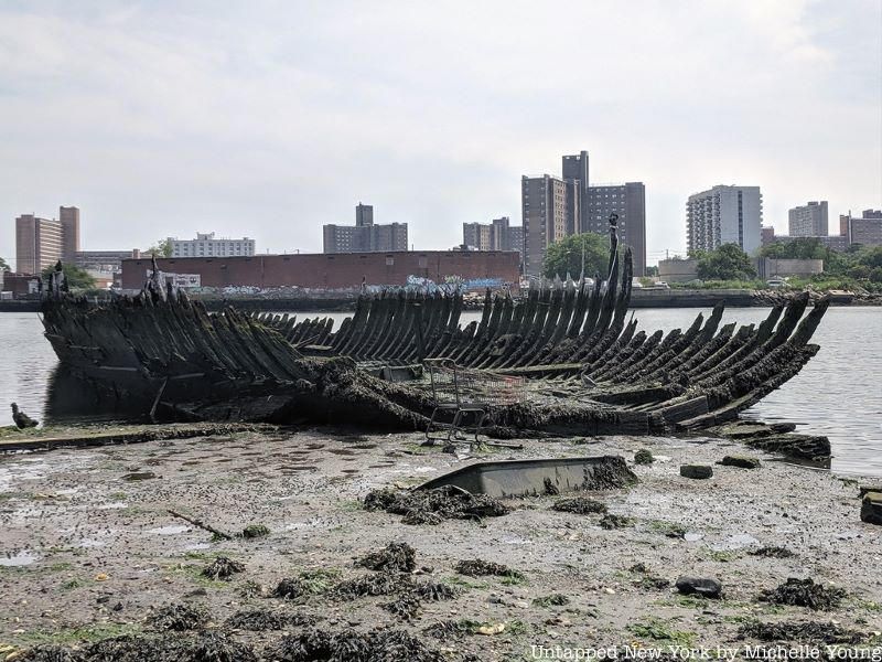 The Quester I — also known as the “Yellow Submarine” of Coney Island Creek — still looks like a hulking, 45-foot-long enigma. The once–bright yellow submarine was built and launched on Coney Island Creek in 1970 by a Brooklyn Navy Yard welder named Jerry Bianco. The Quester had raised several small wrecks in Gravesend Bay before it broke loose during a storm in 1981 and wrecked at its current location. The Quester’s original purpose was to find, raise, and salvage the Andrea Doria, a cruise ship which sank off Nantucket Island following a collision.