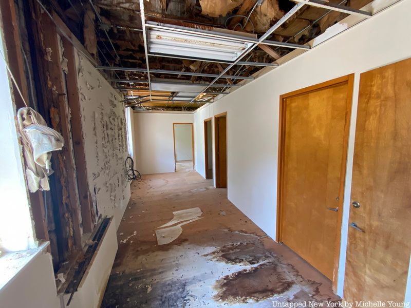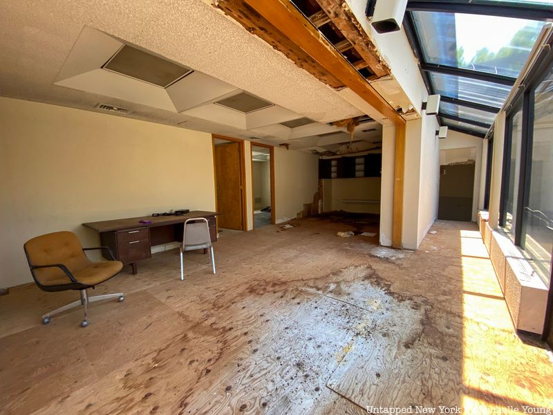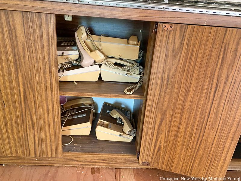 Around the garage and on the upper floors, the spaces have been subdivided into offices, with an abundance of furniture and vintage telephones still remaining. The smell of rotting wood and water damage abounds. These areas of the Clock Tower building also once held a laboratory where Reynolds wrap was invented. The Reynolds family owned the Winfield mansion after Woolworth’s death.
