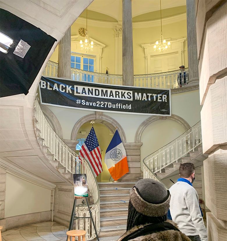 Yesterday’s celebration of the landmarking of 227 Duffield Street involved both a community event in front of the home attended by Mayor Bill de Blasio and his wife Chirlane McCray. Another event took place inside City Hall. Although not required legally, the Landmarks Preservation Commission usually seeks buildings of architectural merit, and has deemed 227 Duffield Street “a rare surviving 19th-century abolitionists’ home in Downtown Brooklyn,” adding that “While a two-story commercial extension was added in 1933, the house retains its 19th-century form and historic fabric above it, and its significant association with the Truesdells and the history of the abolition movement in Brooklyn prior to the Civil War is still legible.”