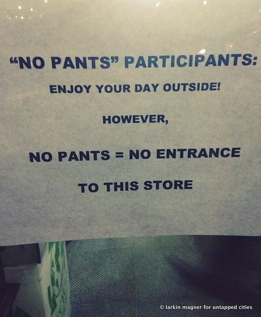 Signs were posted in the Barnes and Noble at Union Square informing pantless participants that their boxers and half dressed selves were not welcome in their establishment. Signs such as the one below were taped to every door on the store.