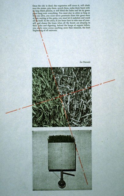 “Once the city is dead, the vegetation will cover it, will climb over the stones, grip them, search them, make them burst with its long black pincers; it will blind the holes and let its green paws hang over everything. You must stay in cities as long as they are alive, you must never penetrate along this great mass of hair waiting at the gates; you must let it undulate and crack all by itself. In the cities, if you know how to take care of yourself, and choose the times when all the beasts are sleeping in their holes and digesting, behind the heaps of organic debris, you rarely come across anything more than minerals, the least frightening of all existents”.