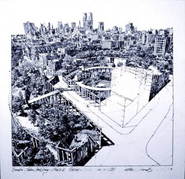 More than 30 architects, including Lebbeus Woods, Neil Denari, Shin Takamatsu, Diller+Scofidio, Imre Makovicz, Dan Coma, BA BA ARC and others, submitted proposals to the exhibition. Spanning conceptual sketches to extensive designs, these submissions explored strategies that positioned the garden as a public amenity with the potential to improve the city’s public housing plan for the site.