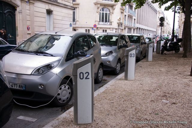 While New York City pushes to expand Citi Bike, Paris remains one of the pioneers of the bike sharing movement and even has an electric car sharing program, the Autolib. As proof of the city’s commitment to the car share, they’ve created an adorable icon that goes on the road where the Autolib parking spots are located. The icon is the shape of the Autolib car, with an electric plug on the end.