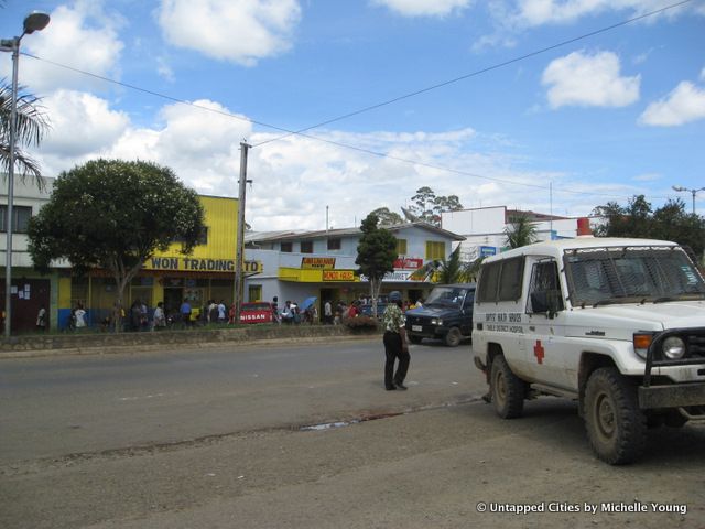 We hop into an ambulance to get to Kundiawa, the town that Tim lives with his wife Kristen. The road is bumpy and unpaved, and there have been a series of landslides recently. However, since the tribes own almost all of the land in the country, it’s hard to clear the roads.