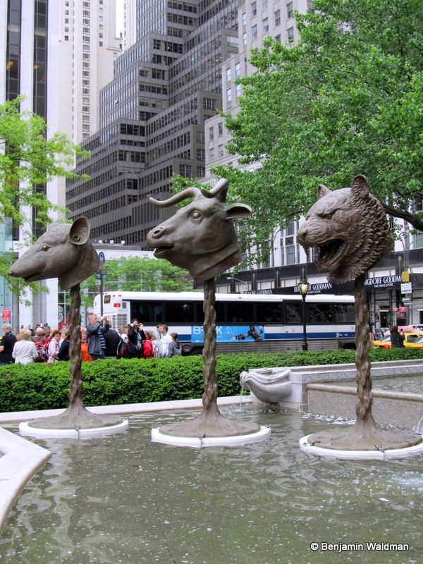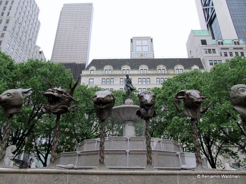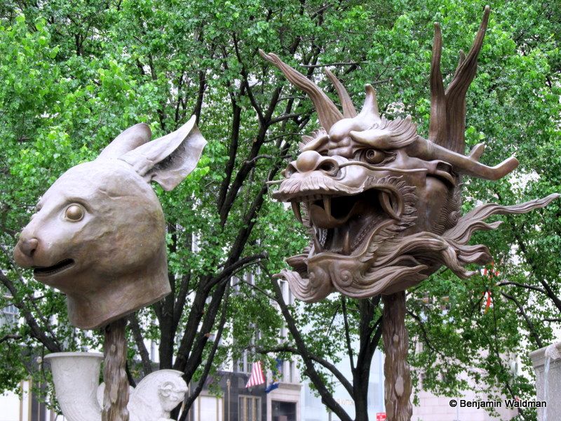 Ai Weiwei, a Chinese artist and activist, produced Circle of Animals/Zodiac Heads, located in the Pulitzer Fountain in front of the Plaza Hotel through July 15. This exhibit, the first to be placed in the Pulitzer Fountain, was inspired by a fountain-clock located at the Old Summer Palace just outside Beijing. The fountain-clock featured the animals of the Chinese zodiac, each spouting water at two-hour intervals. During the Second Opium War the fountain-clock was destroyed and five of the animal heads were lost to time. Weiwei’s twelve heads are cast bronze, each weighing about 800 pounds, and are set on bronze bases. The artist said that his “work is always dealing with real or fake, authenticity and value and how value relates to current political and social understandings and misunderstandings, however, because Circle of Animals/Zodiac Heads is composed of animal heads, it’s a work that everyone can understand, including children and people who are not in the art world.”
