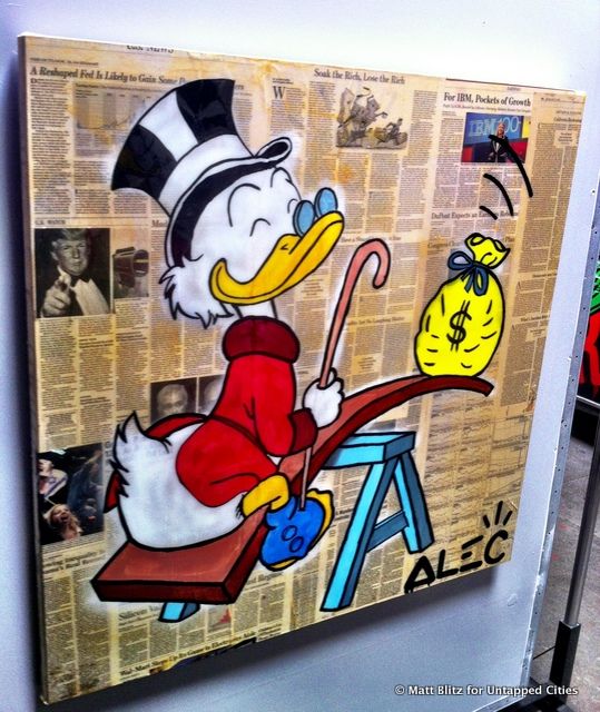 Alec Monopoly is an unidentified street artist who has become famous in New York and Los Angeles for his use of the Monopoly Man to represent capitalism, economic access, and American consumer culture. He does his work under the guise of night and he remains a mystery to many. His art can be seen in urban centers carefully painted on sides of buildings, meticulously drawn on sidewalks, plastered on lamp posts, and now, in Lab Art – a street art gallery on La Brea Ave in Los Angeles.