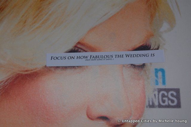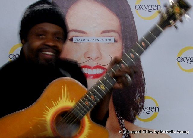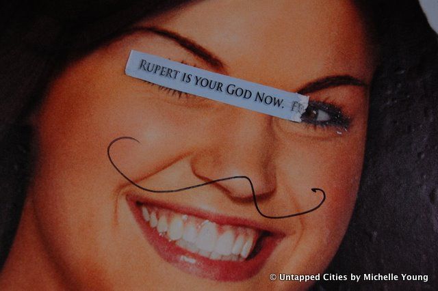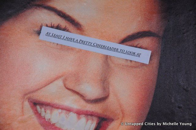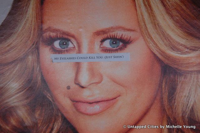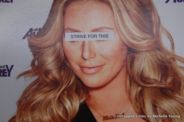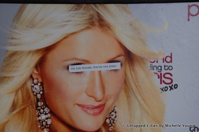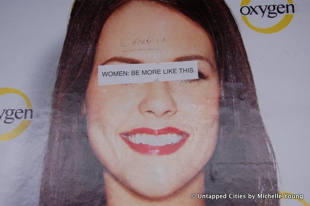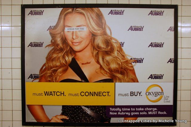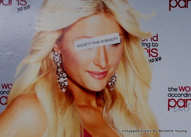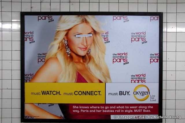 The Oxygen network is really pushing its reality TV programming and bought all of the ad space in the tunnel at 14th Street between the 1/2/3/F/M trains and the L trains. But in an amazing campaign of street art/graffiti vandalism, (2 sets of) sassy stickers were pasted over the eyes of Paris Hilton, Tori Spelling, Aubrey and other reality TV stars, while someone else (or the same person) added mustaches and beauty marks on the faces. “I’m Important!,” “Society: This is Beauty,” “Strive for this,” “Women: be more like this,” proclaim the stickers. Enjoy these photographs of the snarky remarks on society, a nice contrast to the Oxygen ad slogan of: “must WATCH. must CONNECT. must BUY.”