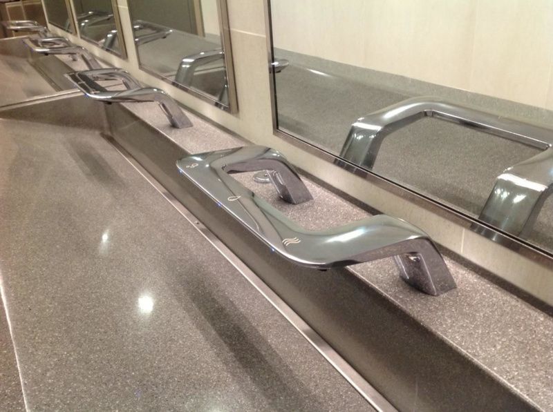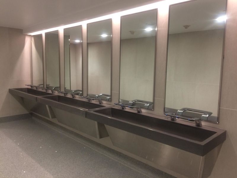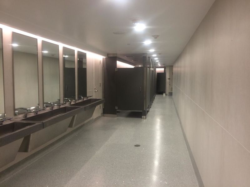 The restroom makeover includes modern wall tiles, terrazzo floors, and energy-efficient light fixtures. New solid surface sinks will also now be equipped with automatic soap dispensers, faucets, and hand driers.