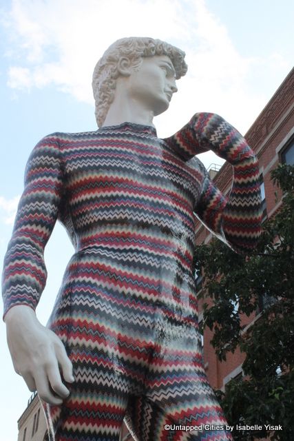 Having just recently materialized on the intersection of 9th Avenue and 14th Street, this imitation of Michelangelo’s David by the Spanish artist dEmo and Italian designer Luca Missoni acts as a boundary-marker for the Meatpacking district and Chelsea. “Gift-wrapped” in a colorful zigzag pattern, their interpretation is certainly a departure from the classical Renaissance piece. I expect Michelangelo, along with other classical sculptors, would cringe at the sight of this sculpture embellished in a parade of colors; nevertheless, it’s peculiar, it’s amusing, it’s Chelsea.