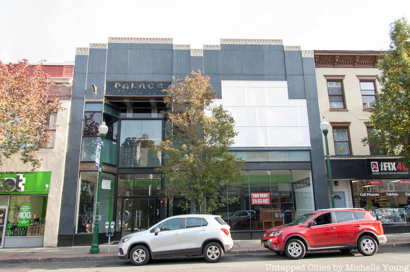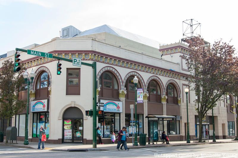 On Main Street, just off Centre Avenue are two former movie palaces that face each other. At 587 Main Street, a historic facade of the original Loews Theatre in New Rochelle still stands, with a new 28-story development by RXR Realty going up behind it. Across the street is the former RKO Quad Theatre (originally the Proctor’s Theater before that). Today, it is used as a school along with retail and other commercial, but you can still see the blue, green, and beige tiling on the facade that runs along the arched windows, column, and friezes.
