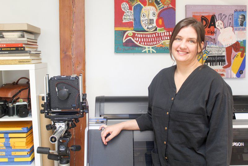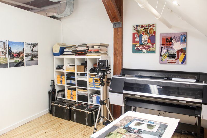 Photographer Amy Regalia’s commute is enviable as a resident of Media Loft, like Larko. She descends from her lofted bedroom to her first-floor work space, adjacent to the inviting open-plan kitchen and dining area. A magnetized wall (for previewing prints) divides the sitting area from her work zone, which is occupied by a large-format printer, a supplies cupboard, the artist’s large format view camera and medium format Hasselblad digital camera, with prints of her current works-in-progress prominently displayed.