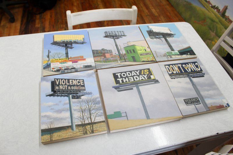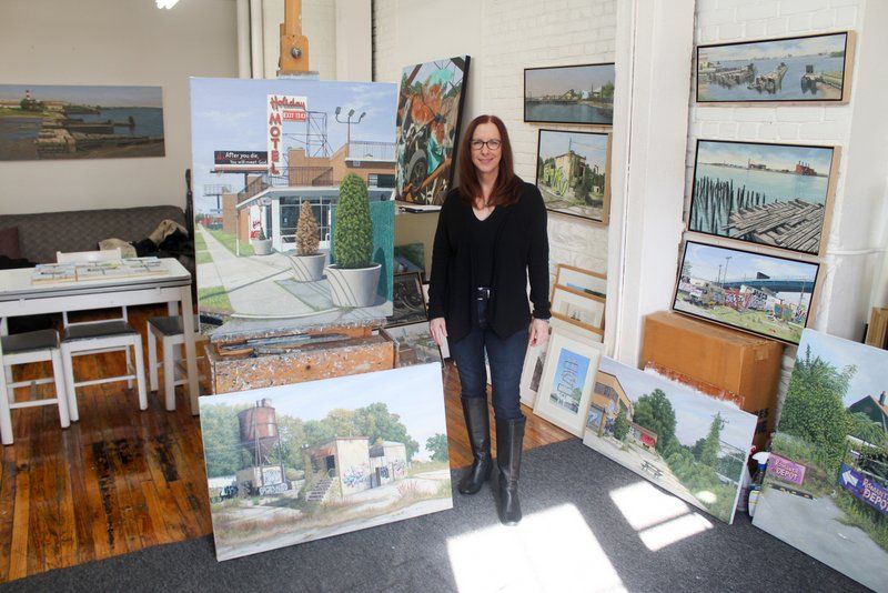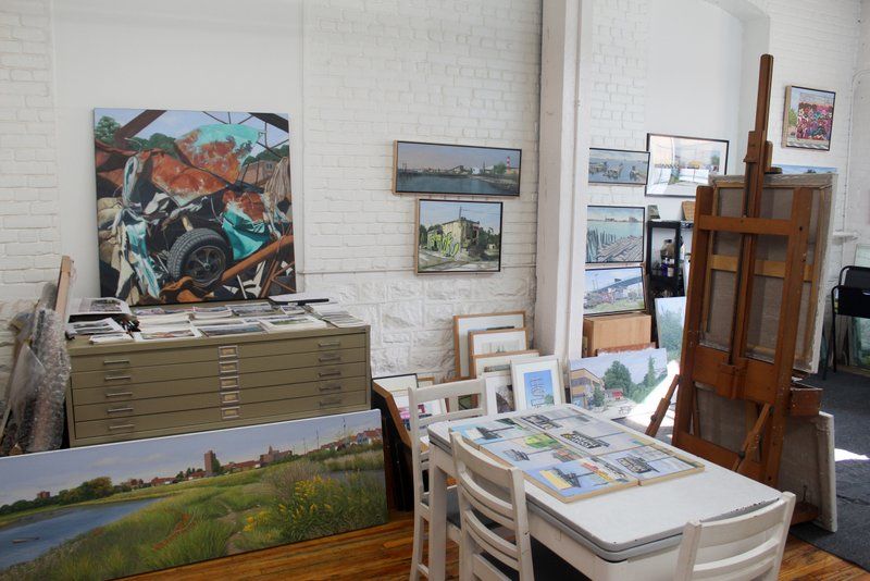 It’s a short walk to work at her first floor studio, and Media Loft provides Larko with a community of creatives and a common area where residents curate a communal gallery on the first floor. Larko’s work examines the overlooked fringes of the urban landscape. Its aging infrastructure, forgotten waterways and graffiti-laced ruins are the draw for her. Here, grit and beauty reside in equal measure. “Each site has its own story to tell, and through patient observation acquired over months of painting on location, I work to bring that story to life and to capture the visual poetry of these places.”