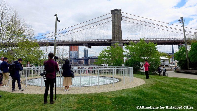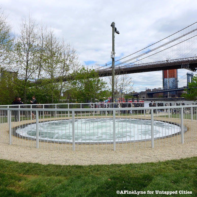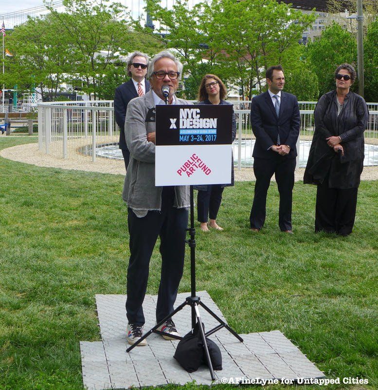 This morning was the official launch of NYCxDesign, New York City’s citywide celebration of design that will run until May 24th. The unveiling of London-based artist Anish Kapoor‘s Descension, a whirlpool of water at Brooklyn Bridge Park, marked the event with a press conference featuring Kapoor, Deputy Mayor Alicia Glen, Nicholas Baume, the Director and Chief Curator of Public Art Fund (the main partner behind the installation), and folks from NYCEDC and Brooklyn Bridge Park. Descension is part of the year-long 40th Anniversary celebration of Public Art Fund.