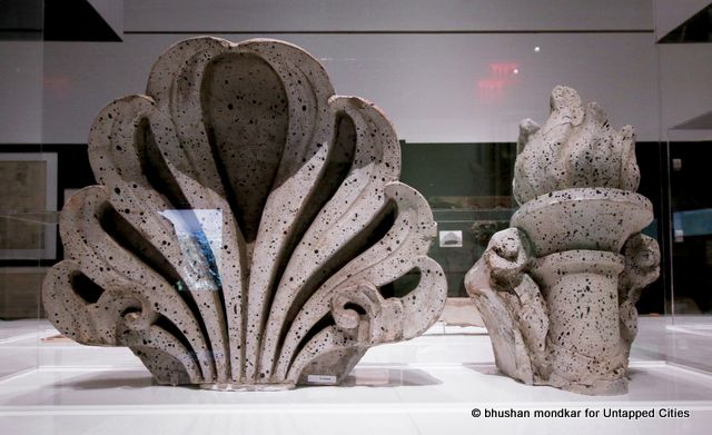 On the left is an original exterior limestone molding from Grand Central Terminal. On the right is a replacement cast stone molding. As curator Donald Albrecht tells Untapped Cities, visitors to the exhibition “may be surprised that they actually were going to tear down Grand Central Terminal at one point. What the preservation movement is about and what it was about in the past is more than you think it is.”