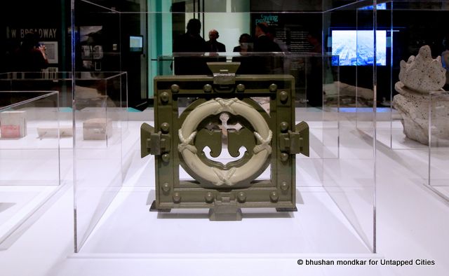 The Battery-Maritime Building, where the Governors Island ferry departs from, underwent a $36 million restoration from 2001 to 2005. This cast-iron medallion is a 2009 recreation of a 1907 original, and weighs 350 pounds. The medallion comes from the collection of Jan Hird Pokorny Associates, the firm that handled the renovation. The exhibition also has a original decorative metal piece from the building: