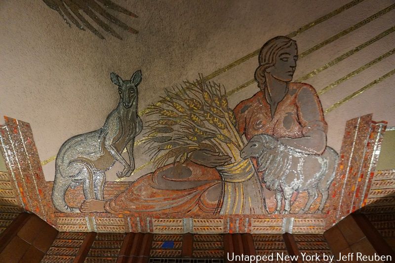 On the ceiling, she created Continents Linked by the Telephone and Wireless, a silhouette mosaic with golden lines connecting allegorical figures representing communication and the continents. It is accompanied by a tile wall map earnestly proclaiming that “Telephone Wires and Radio Unite to Make Neighbors of Nations.” The motif continues with lines on the floors and walls and also fits in well with the angular Art Deco exterior.