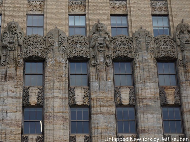 As for exterior ornament, an excellent summary was provided by architecture critic Lewis Mumford, who wrote in The New Republic that “Mr. Walker has turned the lower stories into a rock garden, giving to the panels over the entrances, and to various other appropriate spots, a free naturalistic covering of birds, beasts, flowers and children.” Mumford paid Walker a rare compliment with the following comparison: “Louis Sullivan used ornament in much the same fashion on his early skyscrapers, but not always so successfully.”