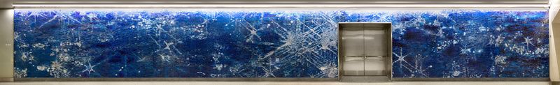 River Light is the first piece that greets you as you enter Madison Concourse from the historic Grand Central Terminal. This specific piece was “inspired by the way sunlight glints on the surface of the East River, the threshold between Manhattan and Long Island.” The mosaic pays homage to the nearby celestial painting on Grand Central’s ceiling, by incorporating celestial bodies. The look of a cyanotype artwork is mimicked by custom-made patterned glass pieces in shades of blue tones and white arranged in a way to provide a sense of movement as visitors pass by.