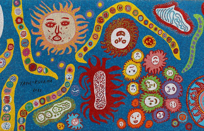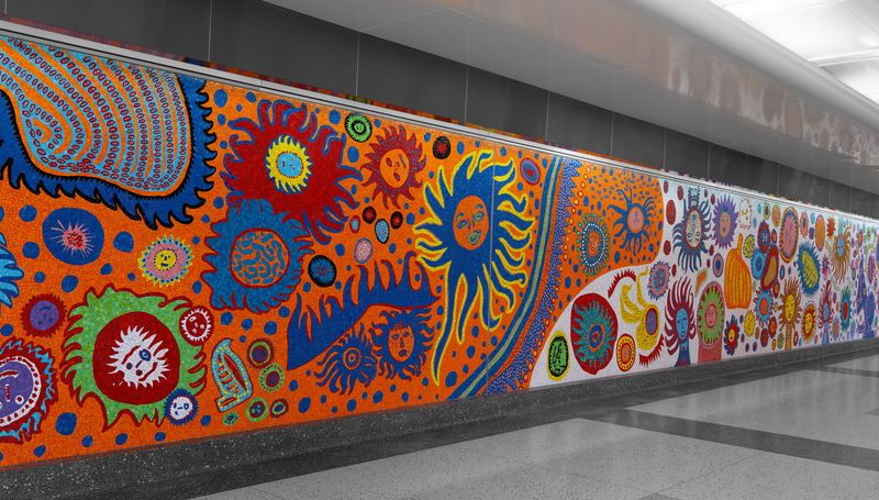 The mosaic features abstract and figurative images that look like faces, the sun, or even microscopic cells. They are meant to evoke the themes of Love, universe, and peace for all mankind, a message central to Kusama’s work. A poem written by Kusama accompanies the mosaic, which was fabricated by Miotto Mosaics Art Studios: