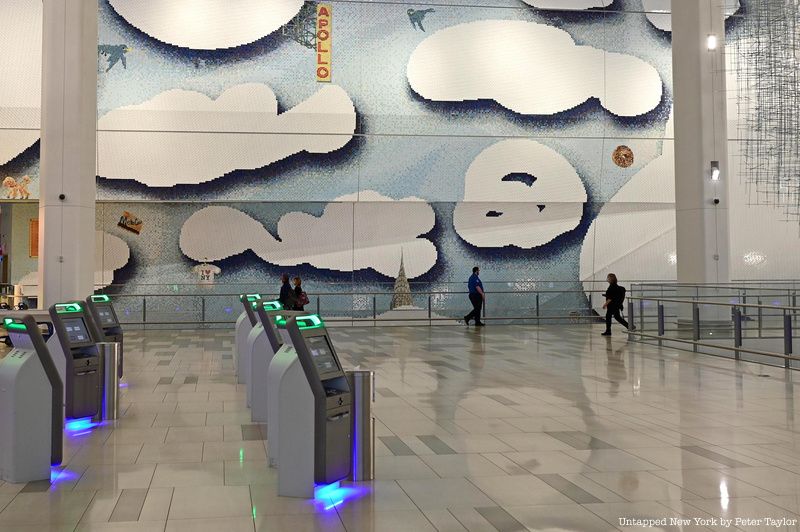 Artist Laura Owens‘s I 🍕 NY is a two-level tiled mosaic mural on the airport’s largest interior wall. The mural depicts clouds amid a melange of New York City sites, such as (the tip of) the Chrysler Building, halal carts, and “I love New York” shirts. Seagulls fly above a sign for Grand Central-42nd Street, while a nearby portion of the wall reveals the winding Coney Island Cyclone and the Wonder Wheel poking out behind a cloud. The work includes symbols of New York’s transit network, as well as some historical and artistic nods, such as the zodiac signs from the roof of Grand Central Terminal.