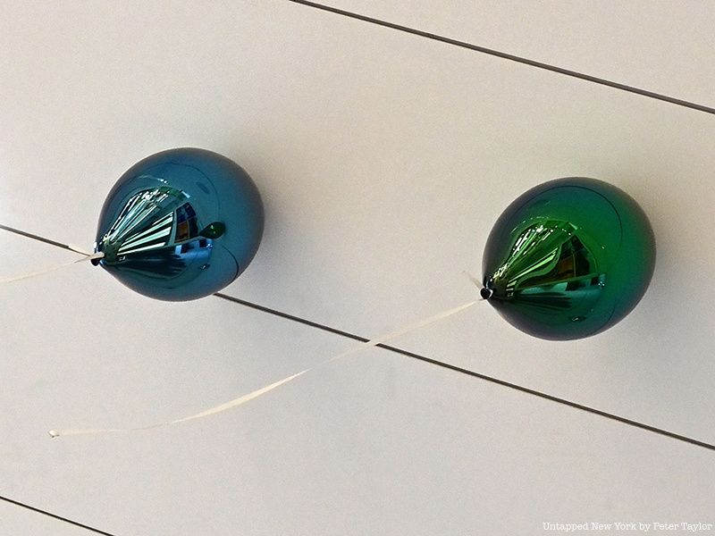 Danish artist Jeppe Hein created an installation called All Your Wishes that includes 70 mirror balloons made of stainless steel. The balloons, which are many different colors, appear to be released into the air and float to the ceiling. The balloons are located near shops, restaurants, and passageways. Also included in the installation is a set of three powder-coated aluminum benches painted red that “curve, loop, and twist to form an irresistible invitation to spontaneous expression and social connection,” according to LaGuardia’s website. Hein called these “Modified Social Benches.”