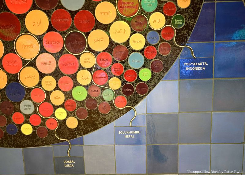 Located by the baggage claim, Mariam Ghani‘s The Worlds We Speak uses data visualization techniques to capture New York’s diversity and is her first tile mosaic. Evoking visions of space, the mosaic is divided into six clusters, representing New York’s five boroughs and the tri-state area, and each contains smaller circles depicting the more than 700 languages and dialects spoken in New York. The circles are all different colors and include the name of the language in English and in the language’s script. Data was collected from the last census and the Endangered Language Alliance.