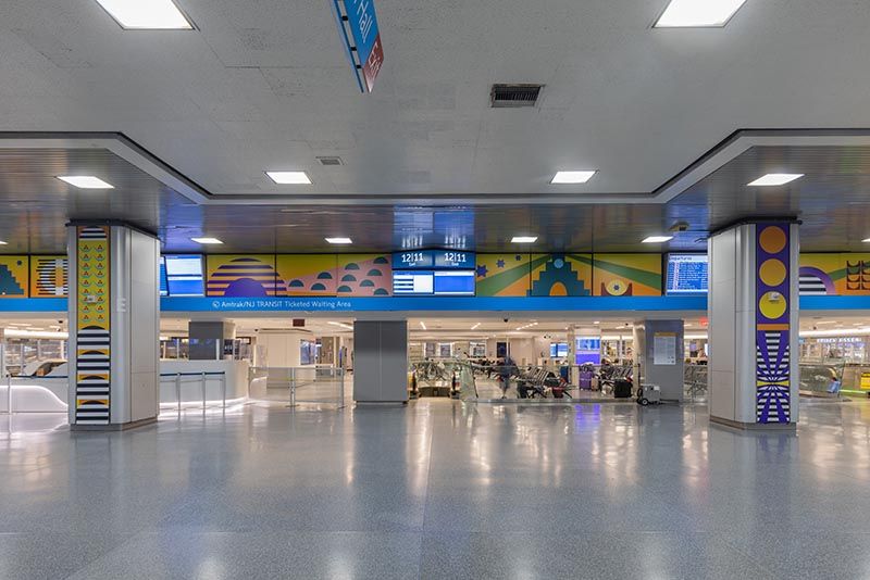 Art at Amtrak is a year-round public art initiative that uses visual works to enliven one of the city’s most important transit hubs. Art at Amtrak specifically showcases the work of New York and New Jersey-based artists. The installation launched in June 2022 with Saya Woolfalk‘s The Emphatics, in the rotunda of the Amtrak area of Penn Station. In 2023, the program expanded into Moynihan Train Hall where art can be found on digital screens. The series is curated and produced by Debra Simon Art Consulting.