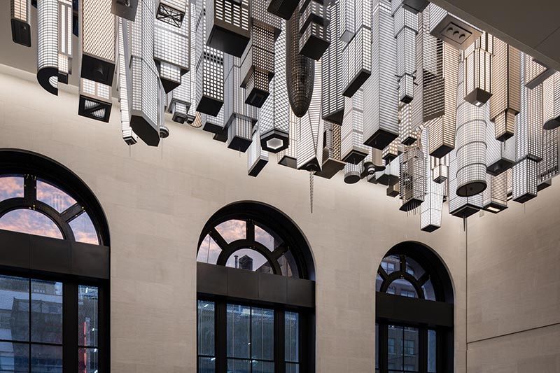 As part of Elmgreen & Dragset‘s work The Hive, over 30,000 pounds of futuristic skyscrapers hang upside down by the West 31st Street entry. The 91 real and fictional buildings, which are nine-foot-tall models, contain windows that glow with 72,000 tiny LED lights. Six of the aluminum buildings can change colors, and there is a mirrored base that allows commuters to feel projected into the miniature city.
