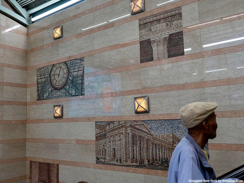 New Jersey Transit commissioned 11 natural stone mosaic panels created by Yakov Hanansen for its new entrance to Penn Station at 7th Avenue in 2007. The mosaics, which are in the series “History Preserved,” include one depicting the entire old Penn Station and many with smaller details. These include details of columns, the street, arches, and the old building’s interior.