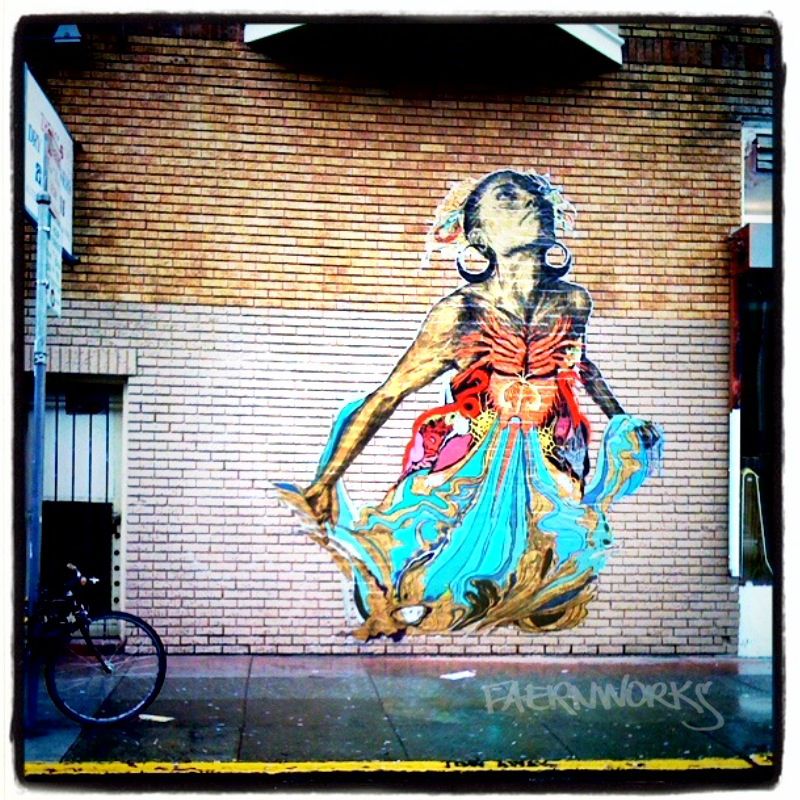 This week we are checking out a piece by the artist Swoon. On a recent visit to our fair city she graced us with this paste-up over on Hampshire, right at 24th Street. If you are going to check it out in person, I suggest that you do it soon-with all this rain, it may not stick to those bricks for long. Incorporating an abundance of nature and art history references, this piece is very bright and flowing, and carries a lot of emotion. However, I particularly appreciate its placement. The only artwork set against a monochromatic brick wall-at the end of a pretty residential block-it jumps right out at you. (In the rain, the wet paper added to this effect.) I got the feeling that strength and perseverance were being birthed right out of the bricks.