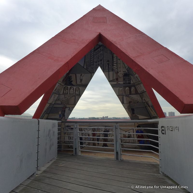 Artist James Emerson created his installation entitled “Bridge” as a classic pyramid, seeking to promote and cultivate the “goodness” that he sees pervading humanity. From a distance it appears as a pyramid, but as you walk past, you will catch a glimpse of paintings throughout the interior space, which draws you around to a short walking bridge entrance inside the installation.