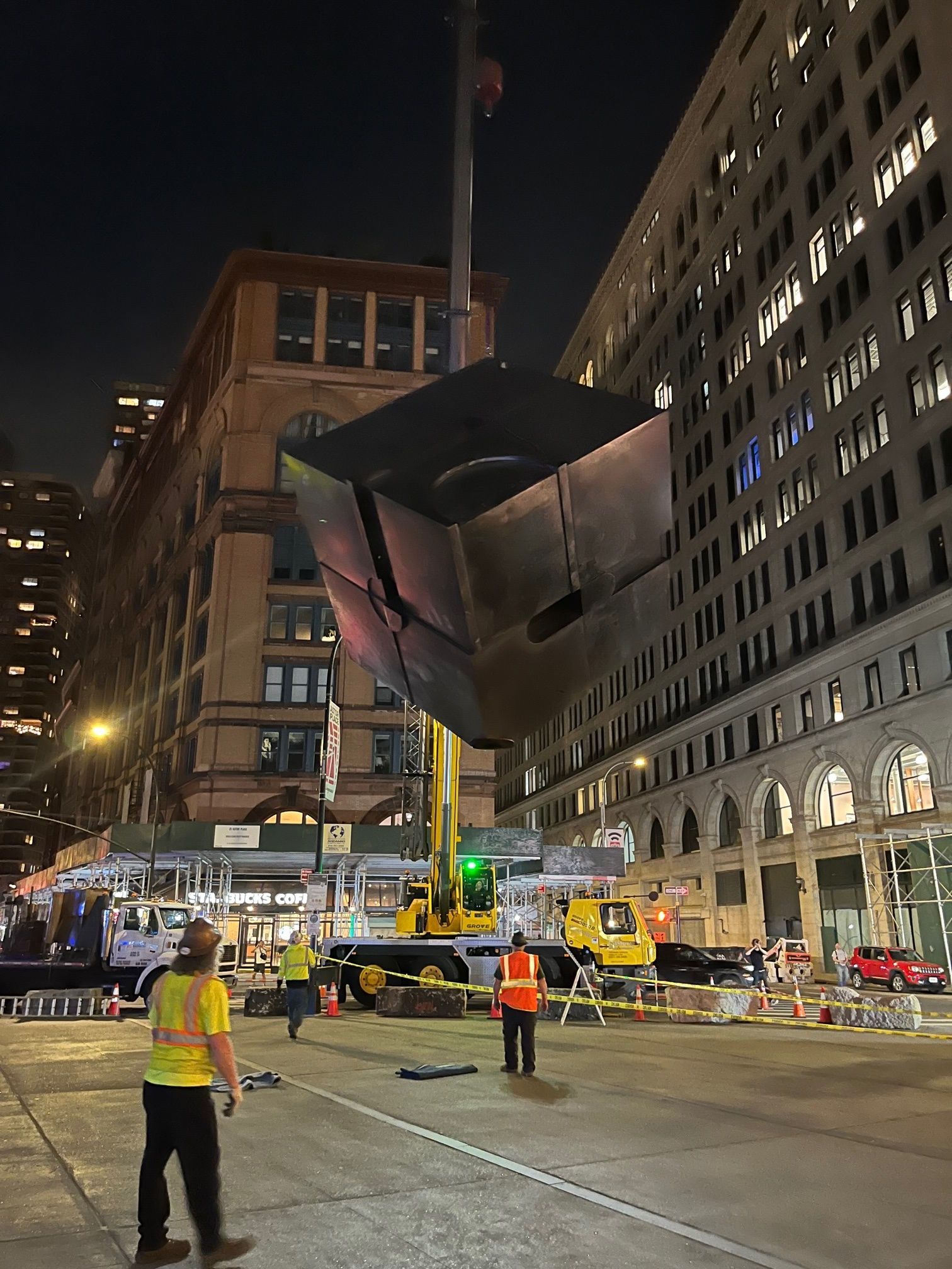 After the sculpture’s initial installation, it was never locked into place, but wear and tear and weather did cause the cube to lose its movement multiple times. In 2004, the cube got stuck and restoration workers had to climb inside to remove rust, unclog drainage holes, and make the piece more water-resistant. The cube was removed for the redesign of Astor Place in 2014. Untapped New York was on the scene in 2016 when the cube was re-installed after a two-year absence.