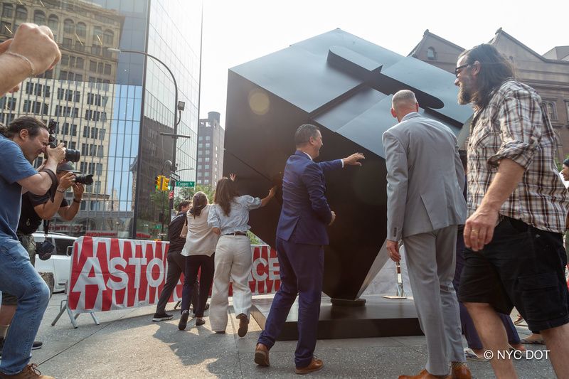 On Tuesday morning, a group of New York City officials including DOT Commissioner Ydanis Rodriguez worked together to push the Astor Place Cube and got it spinning once again. After a months-long restoration, the cube made it’s debut at the Hamptons Fine Art Fair in Southampton over the weekend before finally making its way back to Manhattan’s East Village.