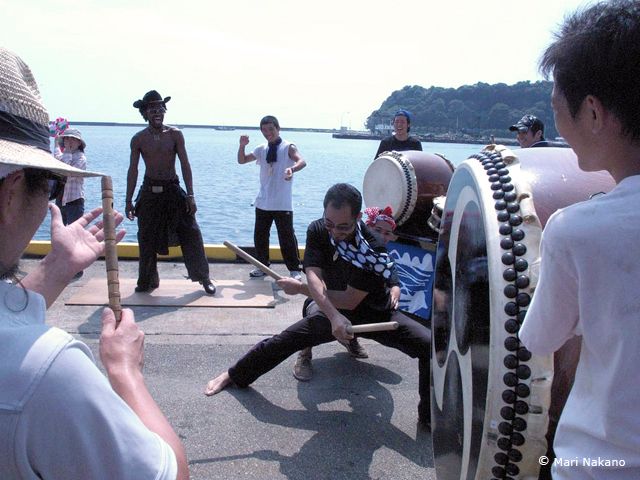 Watanabe playing Miyake-style on a large taiko drum at Ogi Port on Sado Island, Japan during Kodo’s annual summer Earth Celebration.