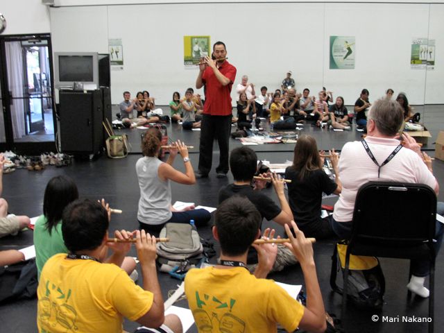 Watanabe teaching shinobue techniques to students at the North American Taiko Conference in Los Angeles, CA.
