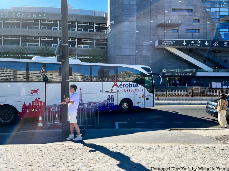 The bus leaves from Porte Maillot (1 metro line) at the edge of the Peripherique (ring highway). Look for the Palais des Congres, a huge convention center with a hotel tower (Hotel Concorde Lafayette). If you are facing the entrance on the roundabout side, the bus picks up at a parking lot across from the left side of the building.