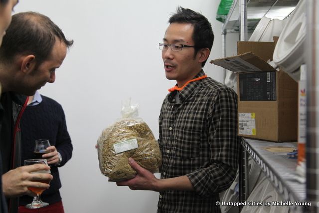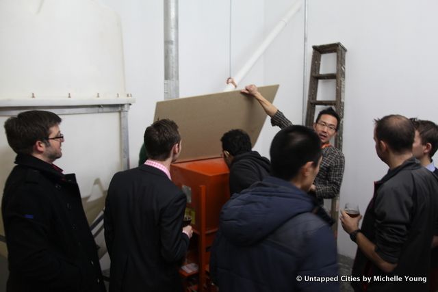 Owner Basil Lee took readers on two tours of the brewery during the happy hour, filling us with fun facts about microbrewing and tasty beer. Basil and his co-owner Kevin Stafford began as home brewers, and it shows with the inventive mix of flavors that are in Finback beers. The Double Sess(ion) is Szechuan peppercorn, chamomile and ginger–but is a great choice as a summer beer or for those that like their beers less hoppy. In the grain mashing room, there are bags of green tea. They’re always experimenting, Basil tells us. And the Fort Tildenist beer is brewed with green tea and lemon zest.